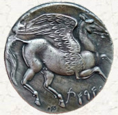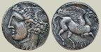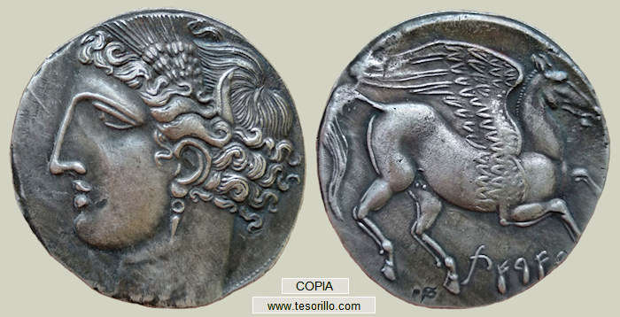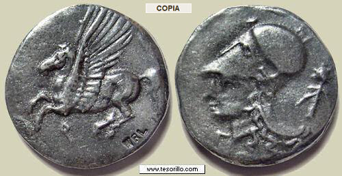 Corresponde a una moneda oficial de plata acuñada en Corinto (345-307 a.C.)