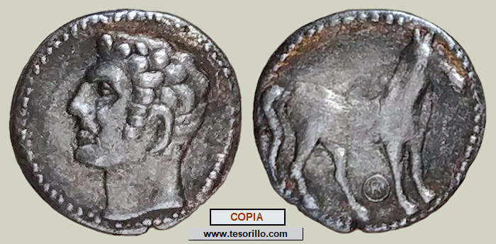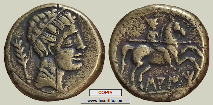 hispano-cartaginesa acuñada a finales del siglo III a.C. (218-206 a.C.?) en ceca carpetana u oretana indeterminada (Akra Leuke?,