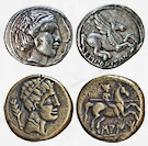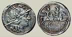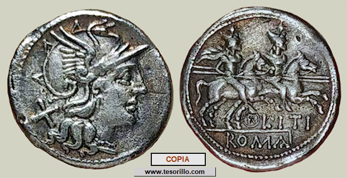 Corresponde al didracma anónimo (de plata y aprox. 7 g) acuñado en Roma entre 269-266 a.C.