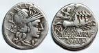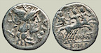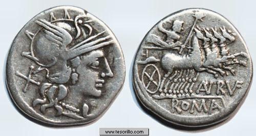 Moneda de plata acuñada en Roma (139 a.C.) por Marcus Aurelius Cotta.