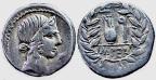 Reverso: instrumentos sacerdotales (lituus y praefericulum) dentro de