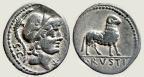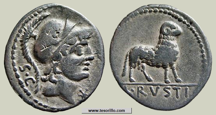 Familia de origen desconocido. Prácticamente nada nos dice la historia sobre esta familia, salvo que hubo un magistrado monetario en la República (L. Rustius) y otro en tiempos de Augusto (Q. Rustius). Durante la República, sus acuñaciones se reducen al bonito denario del carnero. |