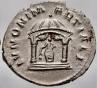 Juno sentada, de frente, en un templo de planta circular con dos columnas