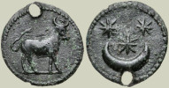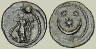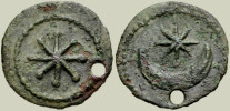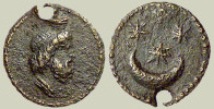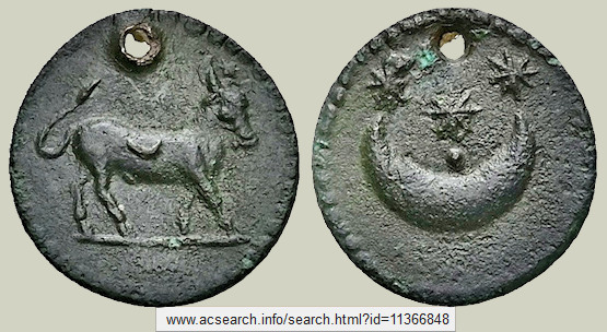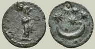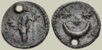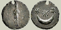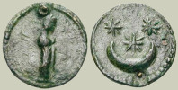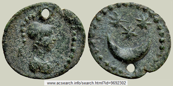 En el libro: "The Coins of Moesia Inferior I-III c. AD. Nikopolis ad Istrum" (Blagoevgrad, Bulgaria 2012), Nina Hristova, Hans-Joachim Hoeft y Gospodin Jekov catalogaron como emisiones seudoautónomas de la ceca provincial romana de Nikopolis ad Istum (Moesia Inferior) unas curiosas fichas que comparten un creciente con estrellas en una cara, mientras que en la otra se representan diferentes divinidades como Sarapis, Sol, Tyche, etc. Se trata siempre de acuñaciones en bronce que no presentan leyenda alguna y que son de reducidas dimensiones (oscilando entre 11 y 13 mm de diámetro y 0,55-1,05 g). La abundancia de monedas en dicha ceca de tiempos de los Severos (fig. 1), con este tipo de reverso, sumada a la existencia de algunas acuñaciones autónomas en las que se indica la ceca pero no el emperador (fig. 2), hacen probable que estas curiosas fichas ("tokens") pertenezcan a Nikopolis ad Istrum (Moesia Inferior) y estén datadas durante el siglo III d.C. (fig. 3). Pero no es seguro, este tipo de reverso es usual en Oriente, otras cecas como Pautalia o Marcianopolis también acuñaron el creciente con estrellas. De hecho, Nikolay Markov, en una reseña del libro citado que fue publicada en "Archaeologia Bulgarica XVII, 2 (2013), pp. 97-98", pone en duda la asignación de estas piezas a Nikopolis, y desde luego niega su naturaleza de monedas: