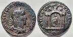 la derecha, con la cabeza vuelta hacia la izquierda. Letras ΠE encima del templo y Senatus Consulto