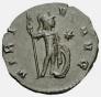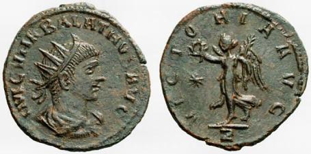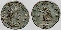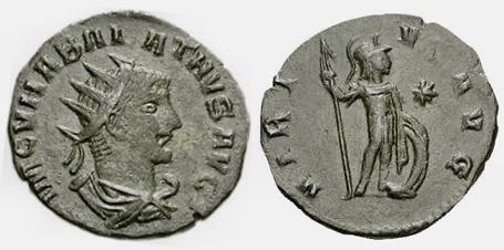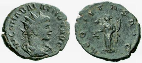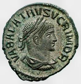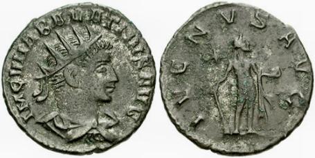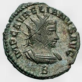 Busto con corona radiada y coraza del emperador Aureliano, a la derecha.