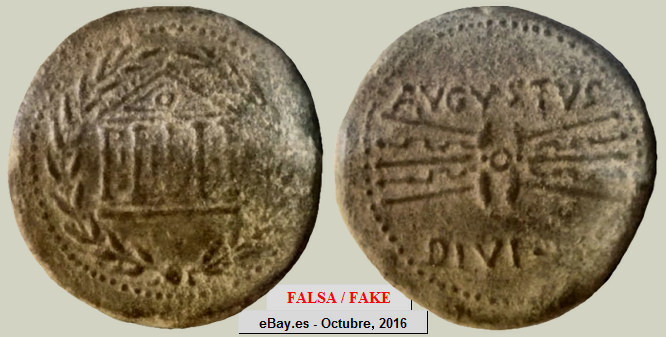 Cuños falsos, (inventados, la cabeza de Augusto laureada a izquierda no existe en este tipo de sestercios).