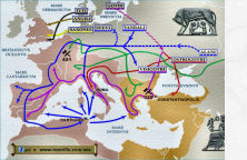 Consecuencia de todo ello, en el siglo V Hispania se componía de siete provincias romanas, pero las invasiones bárbaras de principios de este siglo dieron paso a una nueva época. El último día del año 406, suevos, vándalos y alanos cruzaron el Rin, derrotaron a los francos e invadieron el imperio romano. Después de devastar las Galias, gran parte de estos pueblos bárbaros cruzaron los Pirineos (409) para invadir Hispania. Los suevos y vándalos asdingos ocuparon el noroeste de la península, en el centro se asentaron los alanos y la zona meridional quedó bajo dominio de los vándalos silingos. Veinte años después de llegar a la península, en 429, el rey vándalo Genserico decidió cruzar el estrecho para invadir el norte de África. Nunca regresarían, terminando así la aventura vándala en Hispania. No se conocen acuñaciones vándalas en Hispania, estas se efectuaron siempre en territorio africano y comenzaron después de recibir de Valentiniano III su tratado como foederati (Numidia, 435), finalizando un siglo después, con la caída de su reino a manos del general bizantino Belisario (533-4). La historia hispana de los alanos es aún más corta, el jefe visigodo Valia, cumpliendo las ordenes de Honorio, atravesó los Pirineos en 417 y pronto acabó con ellos, los pocos alanos que pudieron haber quedado fueron absorbidos por los vándalos. No se conocen acuñaciones de los alanos, ni en Hispania, ni en ningún otro lugar. A mediados del siglo V los suevos tomaron importantes plazas del sur, como Emerita o Ispali, pero cuando su rey Requiario avanzó hacia la Tarraconensis, motivó la inmediata intervención del visigodo Teodorico II, quien derrotó, capturó y dio muerte a dicho rey (455) y restauró las fronteras iniciales, replegado a los suevos hacia sus primitivos territorios de Gallaecia. Tras un siglo oscuro, del que tenemos pocos datos, el rey visigodo Leovigildo acabó con toda resistencia sueva en 585-6. El reino suevo no llegó a cumplir los dos siglos de existencia. Sus acuñaciones en Gallaecia fueron escasas, desde cecas inciertas y normalmente en oro (c. 435-c. 586), siendo la mayoría seudoimperiales (a nombre del emperador del momento).