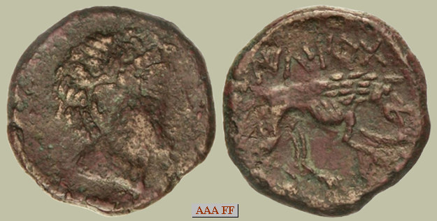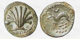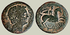 Anverso: cabeza de varón mirando hacia la derecha; pequeño jabalí detrás de la cabeza.