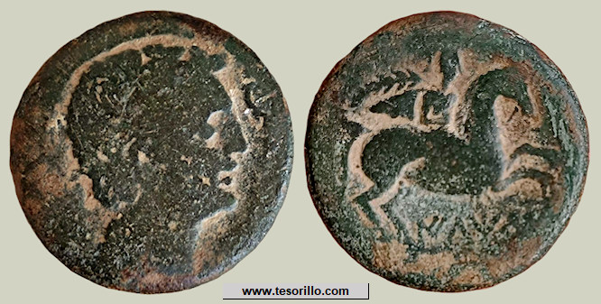 Anverso: cabeza femenina galeada a la derecha, delante caracteres ibéricos