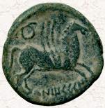 Reverso: anepígrafo, Pegaso a derecha, debajo dos círculos.