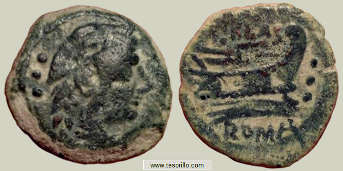 Moneda de bronce acuñada en Roma por Publius Cornelius Publii filius Blasio, entre los años 169-158 a.C.