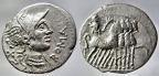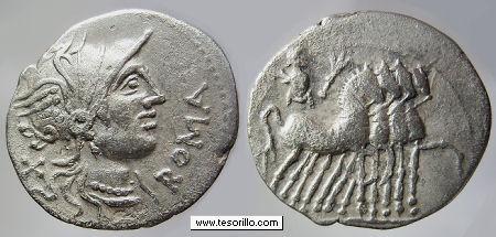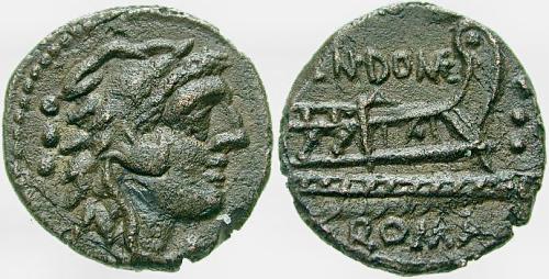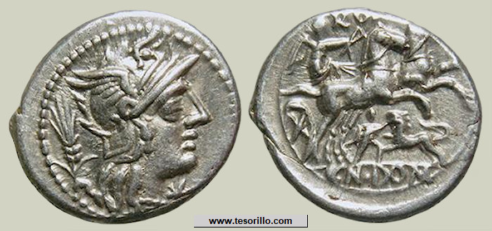 Familia plebeya y después noble (patricia) que cuenta con numerosos representantes ilustres, en dos grandes ramas, los Ahenobarbus, nombre que significa "barba de color de bronce" y los Calvinus, seguramente aludiendo a su escasez de pelo. Pretendían ser participes directos de los primeros pasos de Roma relatando que los Dioscuros, que ayudaron a los romanos en la batalla del lago Régulo, hicieron el milagro de cambiar el color de su cabello. En 41 a.C. Cn. Domitius Ahenobarbus, general partidario de Pompeyo, acuñó denarios desde el Oriente y en 39 a.C., Cn. Domitius Calvinus, general leal a J. Cesar, utilizó la antigua ceca de Bolskan (Hispania) para emitir denarios conmemorativos de su victoria contra los ceretanos. El emperador Nerón es el descendiente más conocido de esta familia. Esta gens acuña tanto oro como plata y bronce, desde varios rincones del Imperio, presentando cierta variedad y desde luego, gran belleza de tipos. |